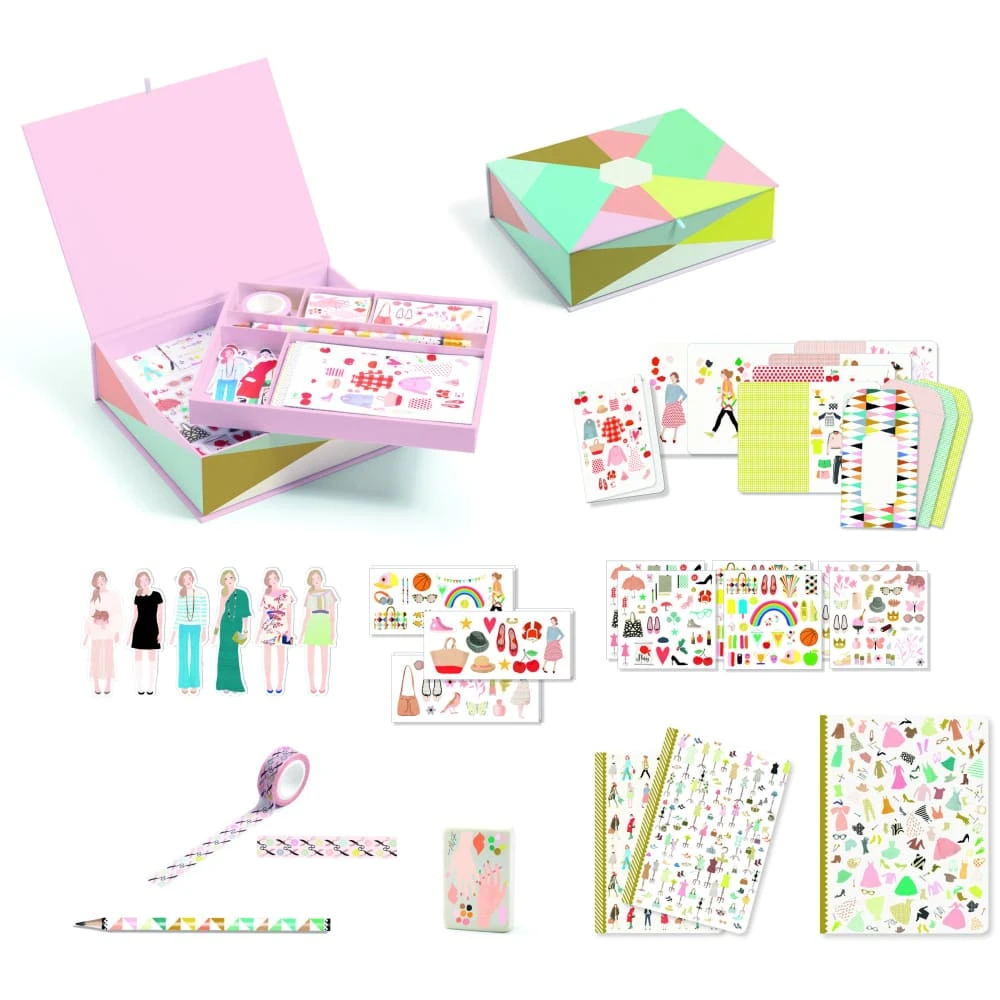 A magical box of beautifully designed stationery, cards, envelopes, stickers, masking tape, pencil, eraser, notebooks all in a reusable collection box.