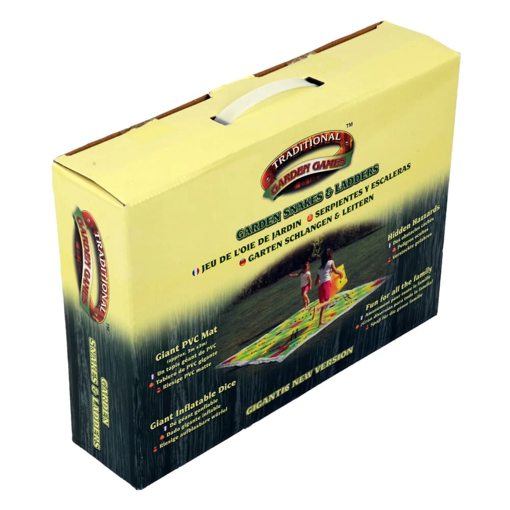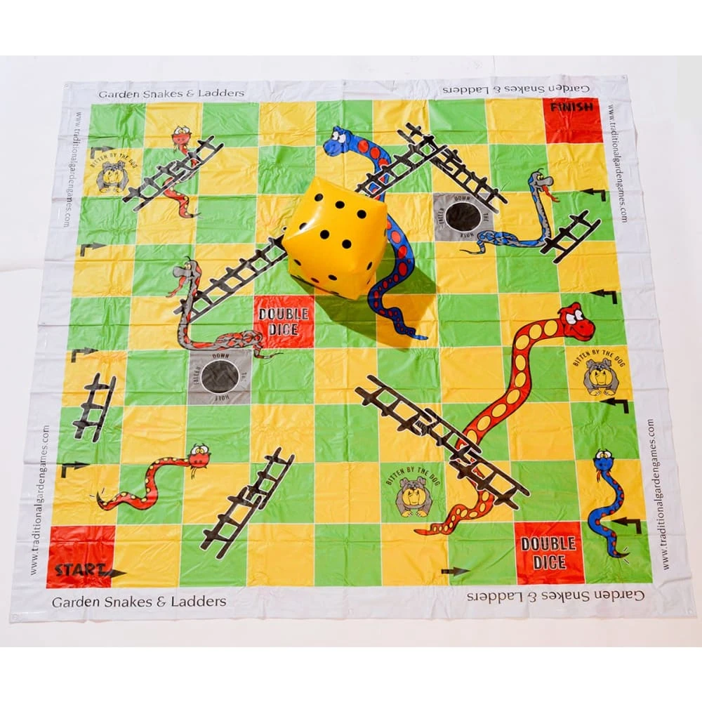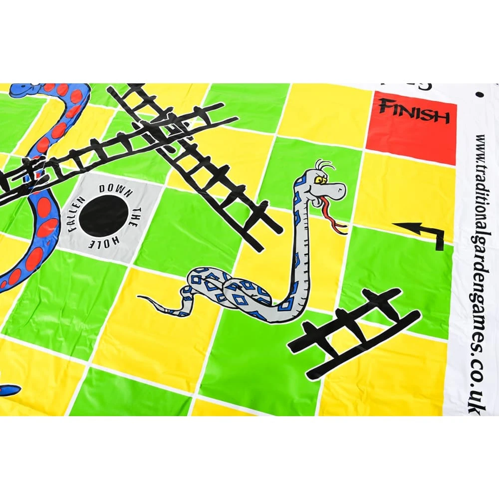 A giant plastic Snakes and Ladders Set with a massive 3 meters by 3 meters heavy duty plastic board with eyelets for pegging into the ground (no pegs).
