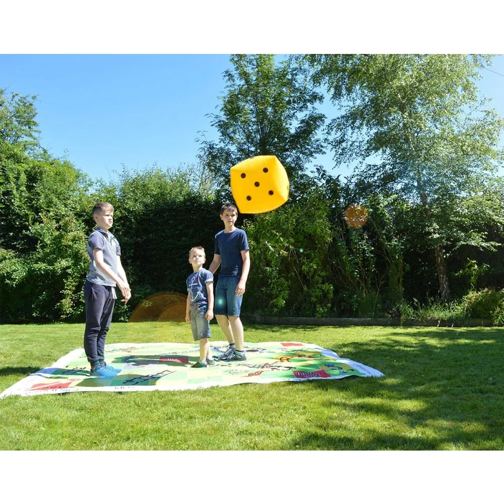 Giant Snakes & ladders game is such fun as you are the counters, moving up the ladders, down the snakes and watching out for hidden hazards, drop down the hole, bitten by dog, as you move around the mat. All made for exciting by the addition of a giant blow up dice 1m square!