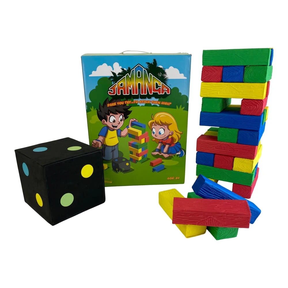 Jamanga is a massive coloured tower with a monster dice! By using your skill and nerve, leave the tower either standing strong or on the brink of collapsing. The tension is unbearable and the excitement unbelievable! Will you collapse under pressure like the tower, or dare you try to stack ‘em high?
