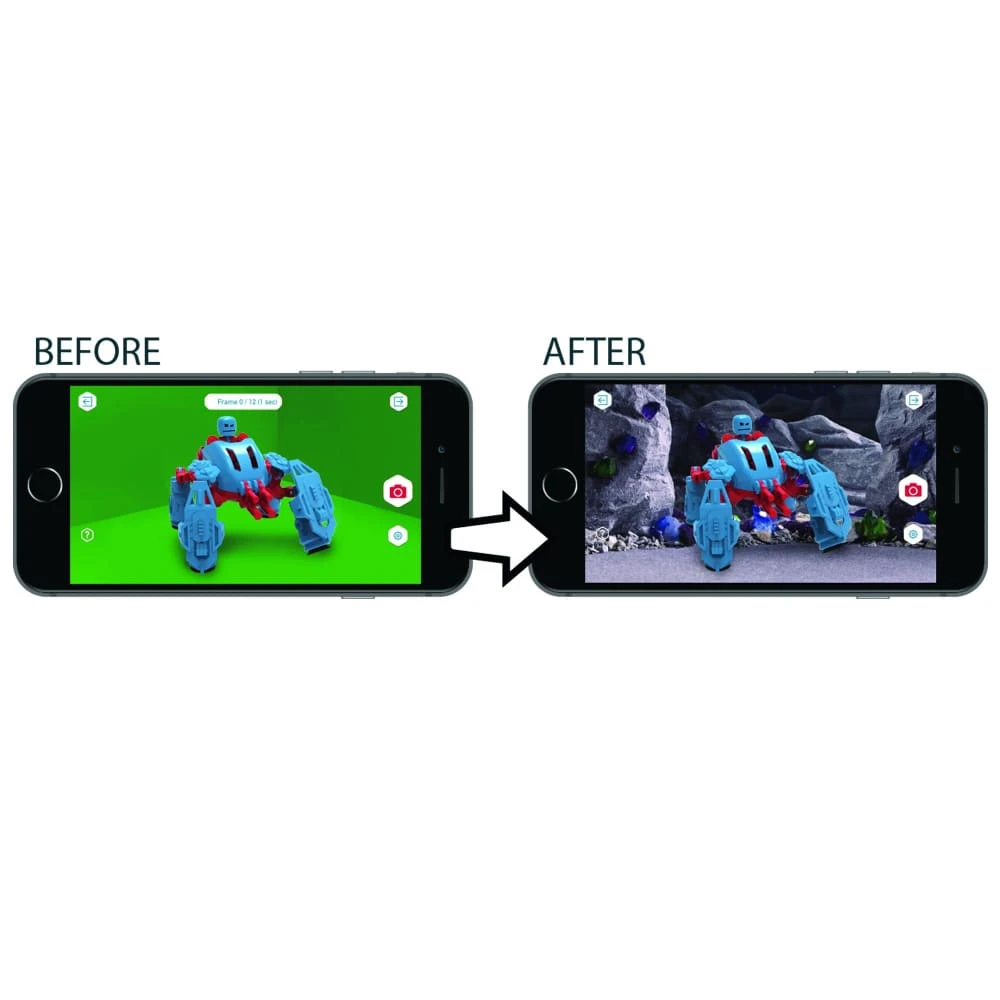 The green/blue screen allows kids to upload their own background images or use backgrounds included in the free StikBot Studio mobile app.