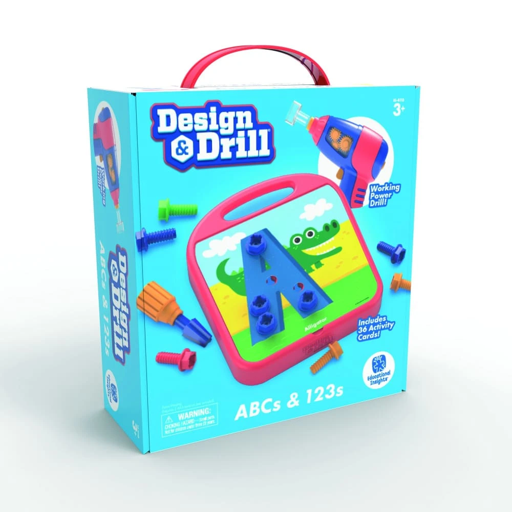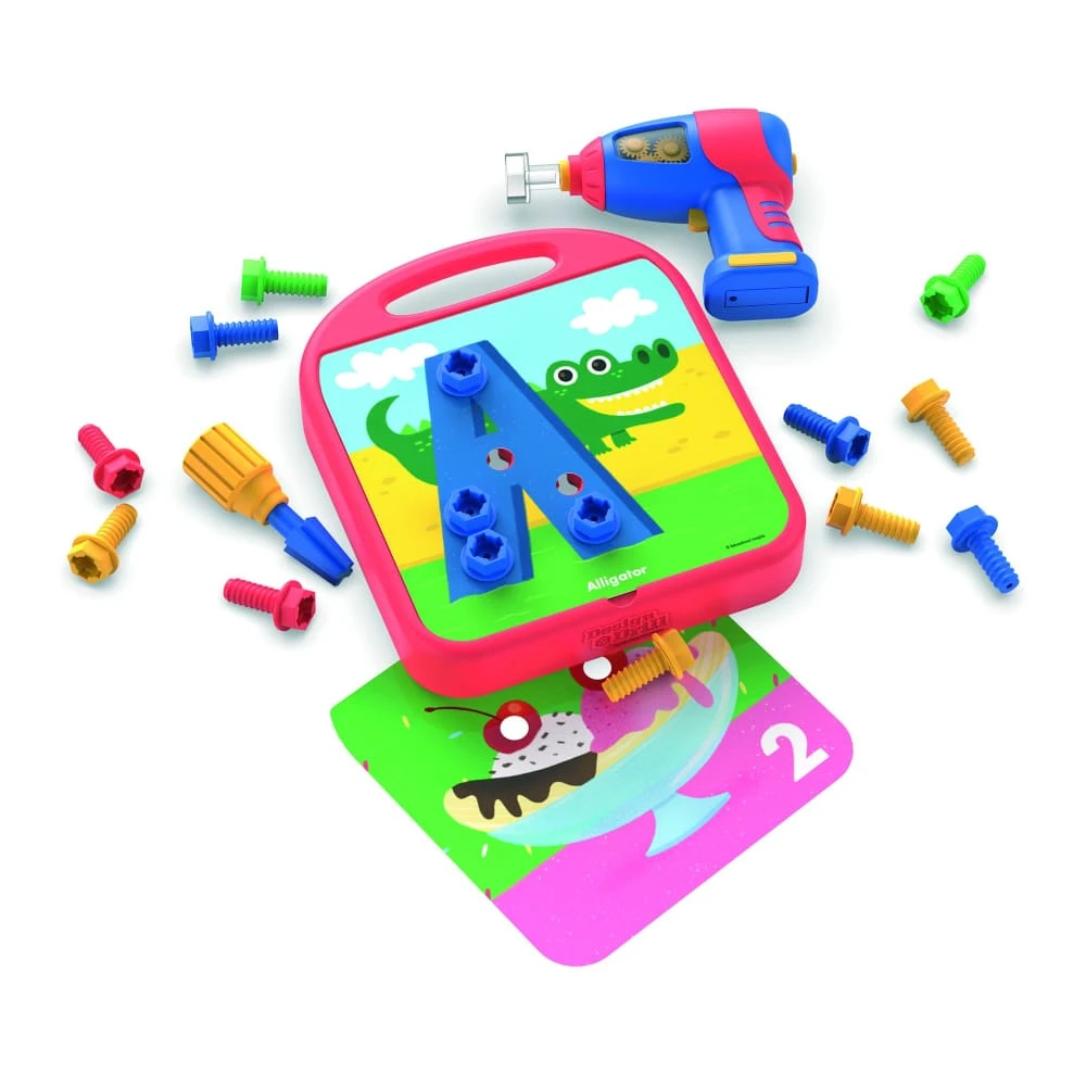 Set includes board, power drill, chunky Phillips screwdriver, 50 colourful bolts, 10 double-sided number cards, and 26 alphabet cards featuring upper- and lowercase letters.