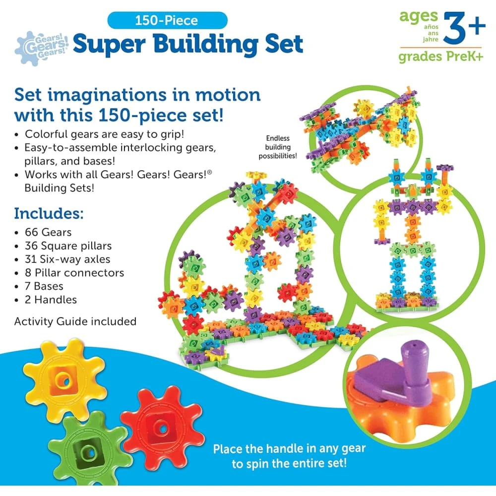 This jumbo set of building gears will keep children entertained for hours. Inside the useful storage tub are 150 colourful gears, cranks, connectors and interconnecting base plates to allow endless creations to be designed and made. This is a creative construction toy which is not only educational but lots of fun.