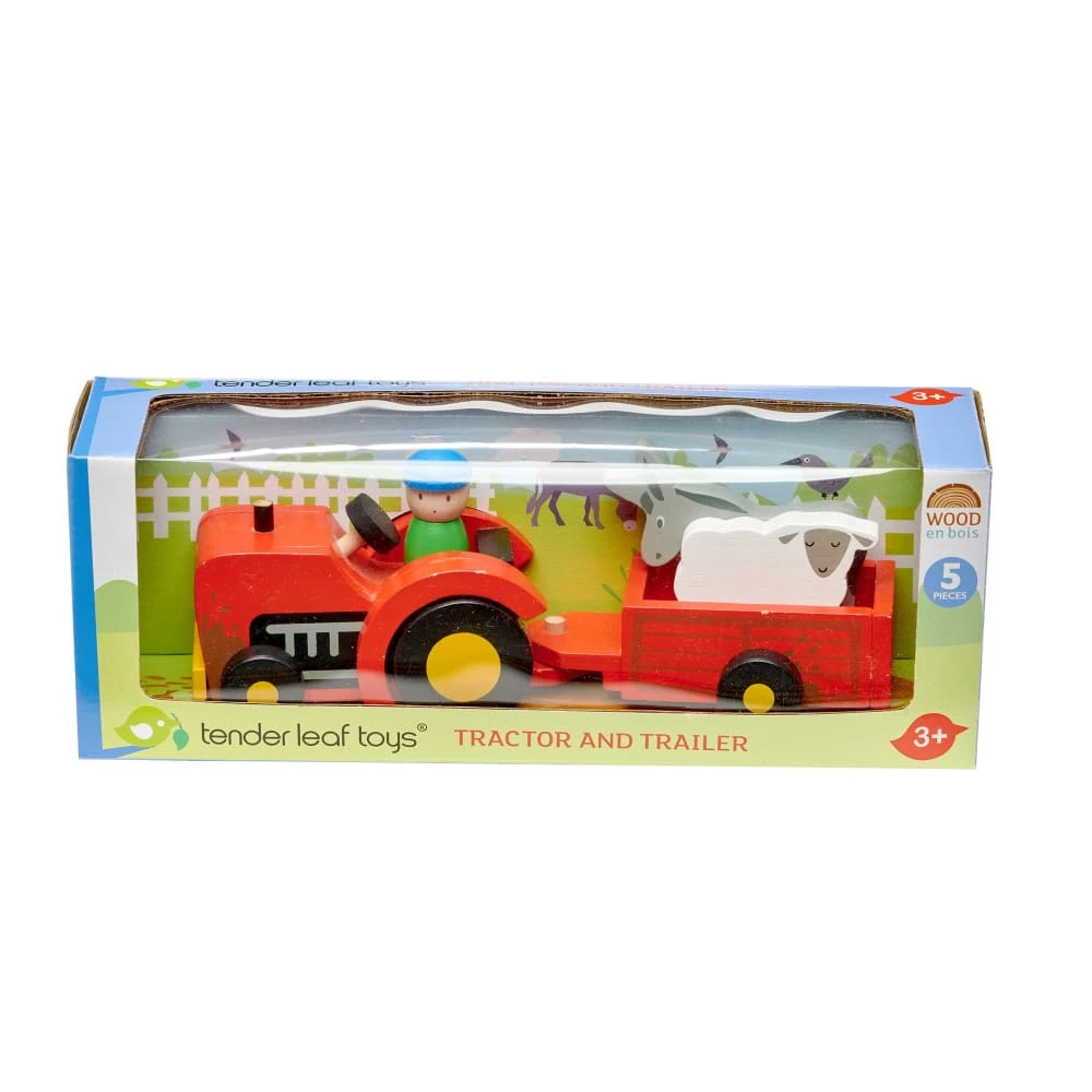A traditional style wooden red tractor and detachable trailer set, with donkey, sheep and removable peg driver make it great pretend play fun for little ones.