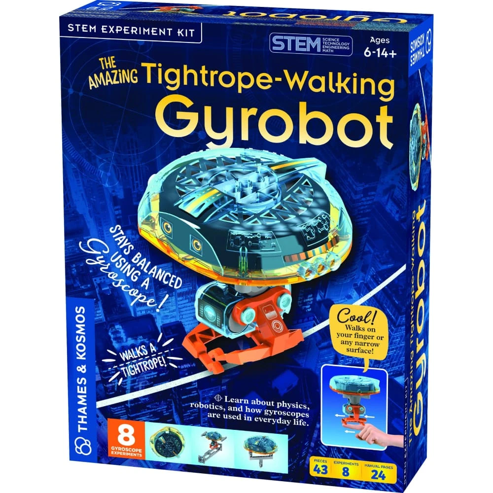 A robot fit for the circus! With this kit, you can build a robot that walks, step by step, along a tightrope….and learn about the physics of robotics and gyroscopes at the same time.